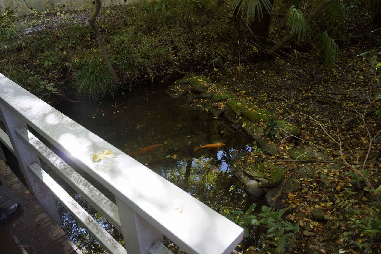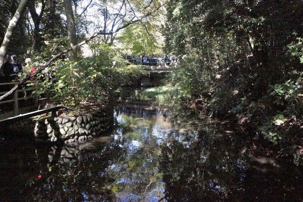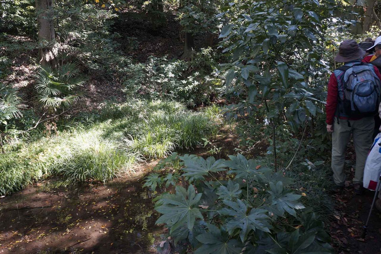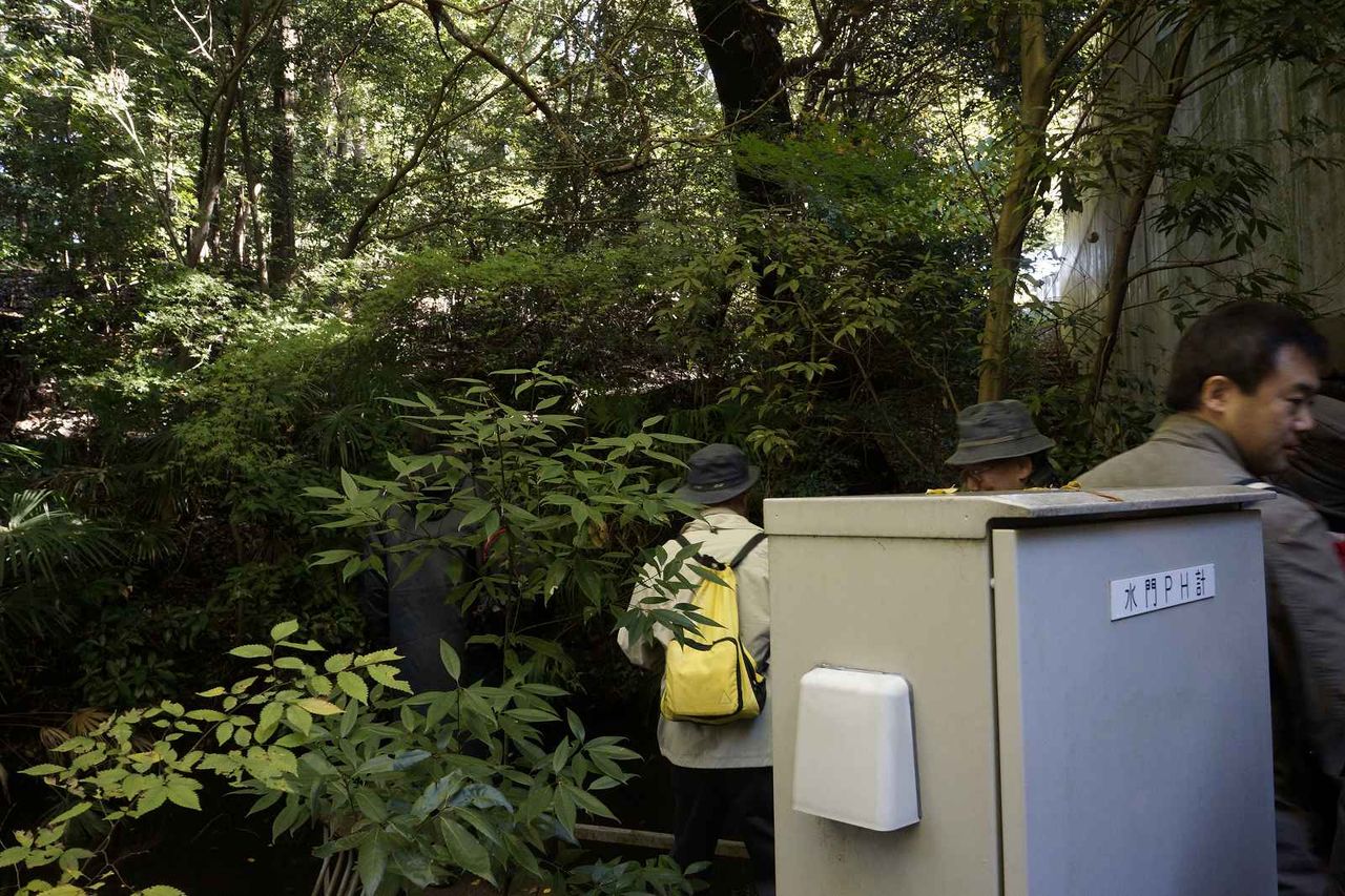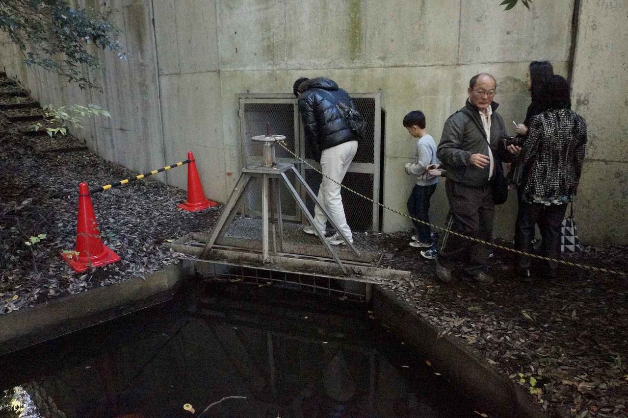 中央研究所内の庭園を源泉とした水が野川へと名を変える水の排出口を見学します。