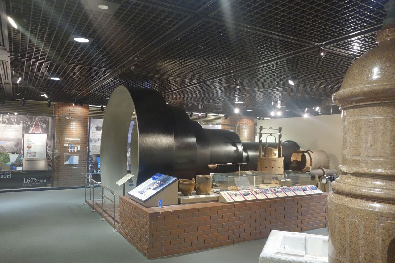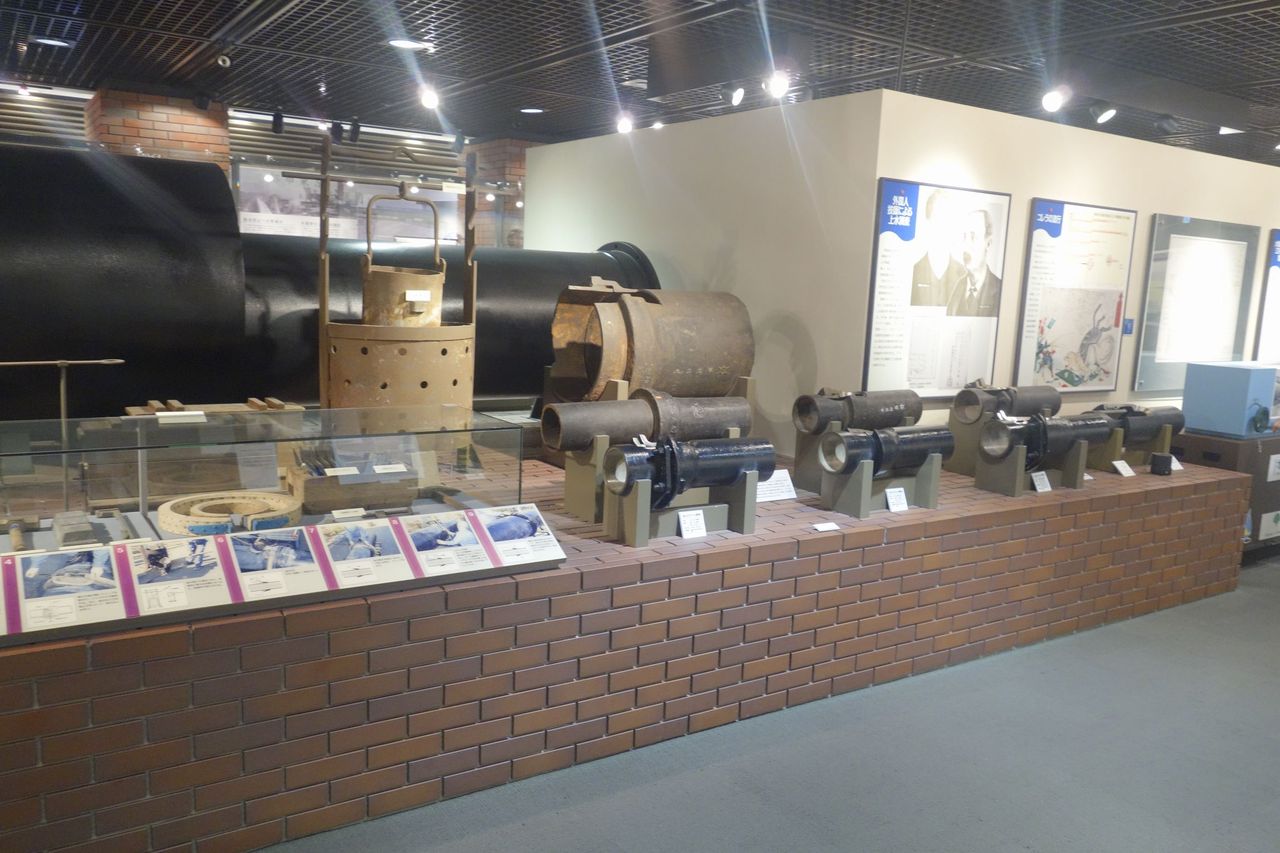 右手にはもっと細く小型化した導水管の展示コーナーもあります。