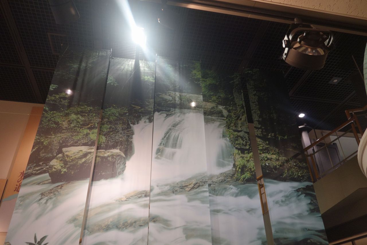 続いては渓流のせせらぎの写真を使った屏風のような姿を見ながら階段へと進み