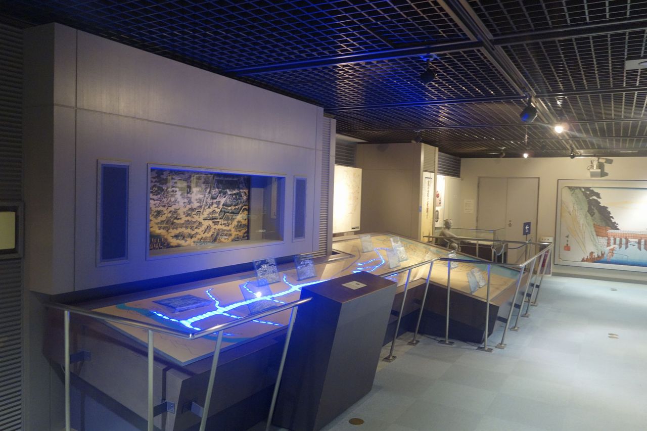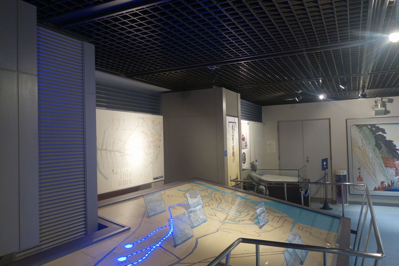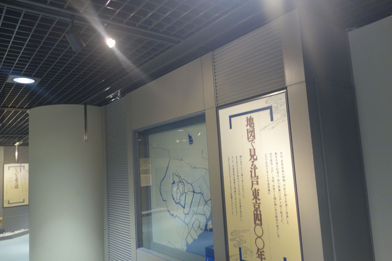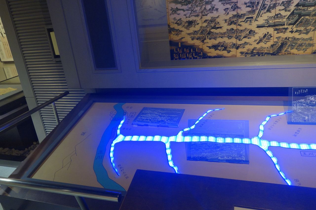 多摩川から江戸へと水を供給する水路のような図が展示され、水の流れがすぐに分かるよう青色のランプが川の模型の下に仕込まれていました。